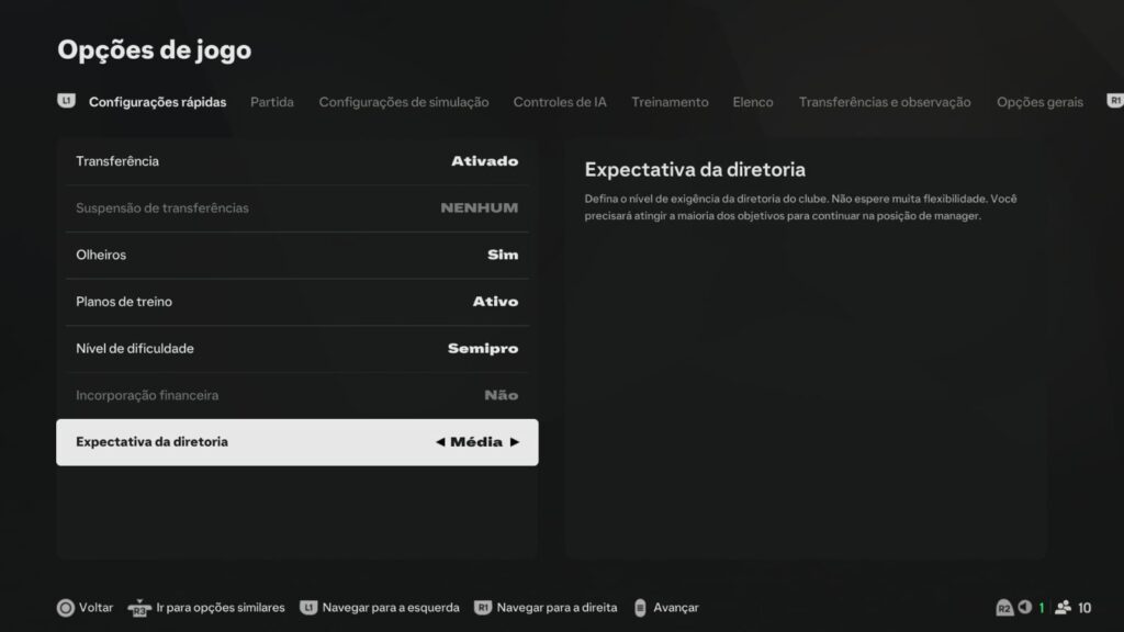 Antes de começar oficialmente o modo carreira treinador, o jogo permite ajustar configurações adicionais, como o nível de dificuldade das partidas, o tempo de duração, a moeda usada no mercado de transferências e a inclusão de competições europeias. Além disso, o FIFA 25 oferece o modo de dificuldade para negociações, afetando o quão fácil ou difícil será adquirir jogadores e negociar contratos.