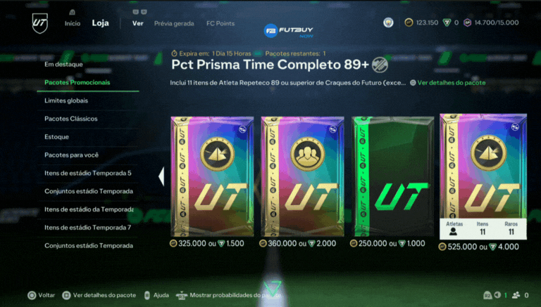 Pacotes Promocionais com Probabilidades Aumentadas, que informam as chances de tirar cartas acima de uma certa classificação (ex: 87+);