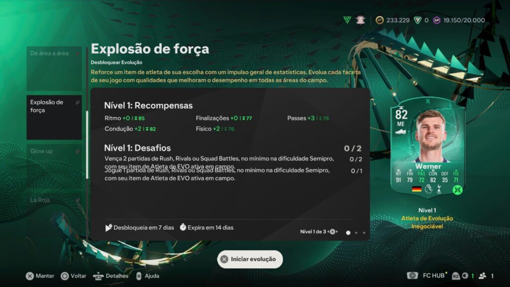 - Para avançar, é necessário vencer 2 partidas no modo Rush, Rivals ou Squad Battles, com a dificuldade mínima em Semipro, utilizando o item de Atleta de EVO ativo. Ao completar este desafio, Werner recebe +3 em Passes, +2 em Condução e +2 em Físico.