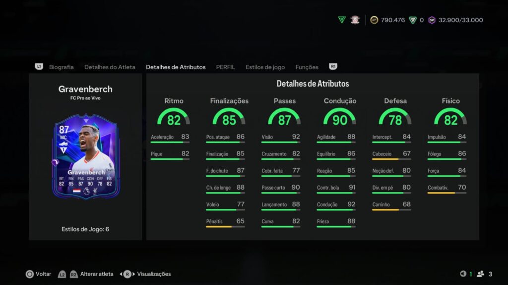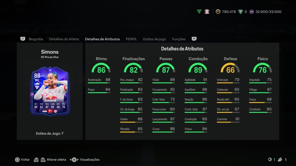 Vale mencionar também que possui 7 playstyles, incluindo a playstyle+ Artilharia, em que faz chutes colocados com mais rapidez, o máximo de curva e muito mais precisão.