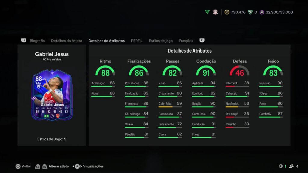 Nessa versão, Gabriel Jesus possui 4 estrelas de Fintas e 4 de Perna Ruim.