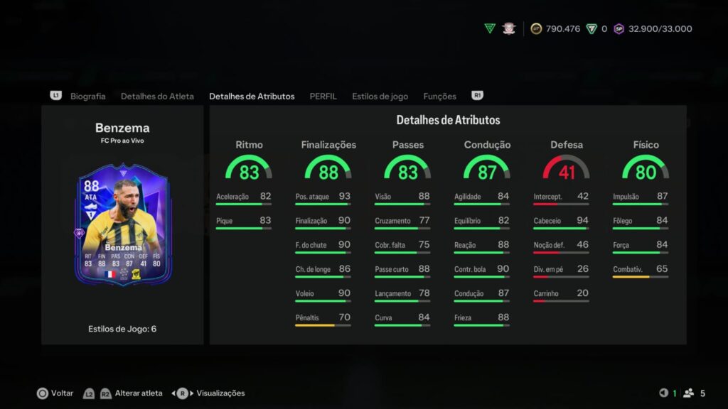 Nessa versão, Benzema possui 4 estrelas de Fintas e 4 de Perna Ruim.