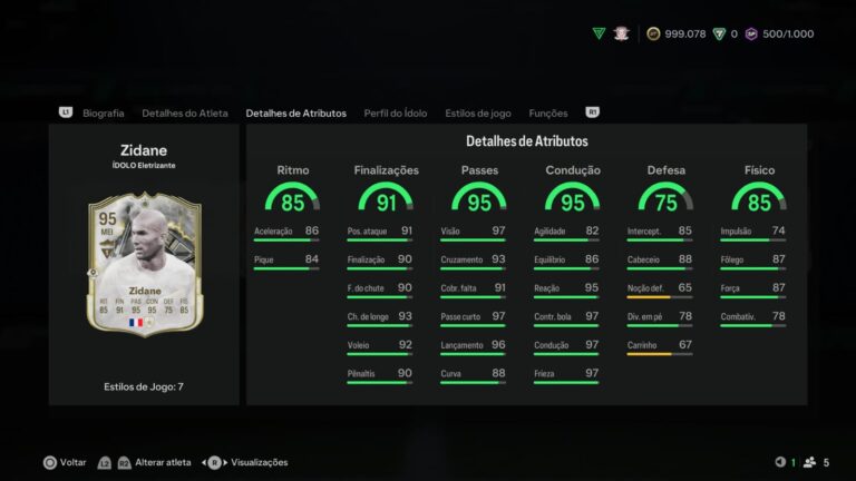 Zinedine Zidane possui 5 estrelas de Fintas e 5 de Perna Ruim.
