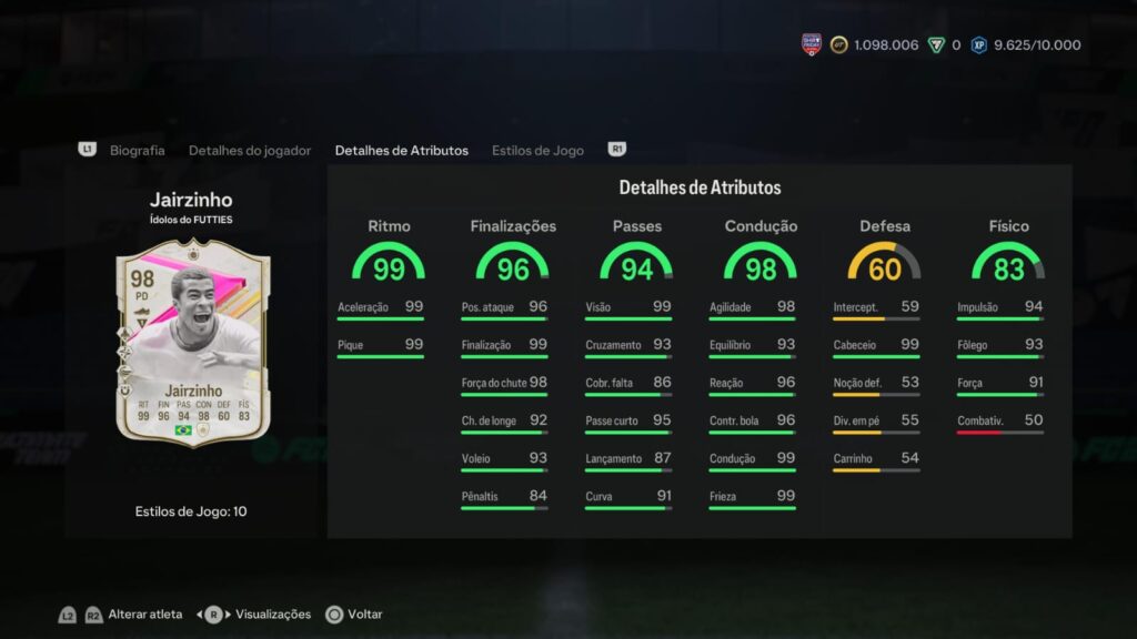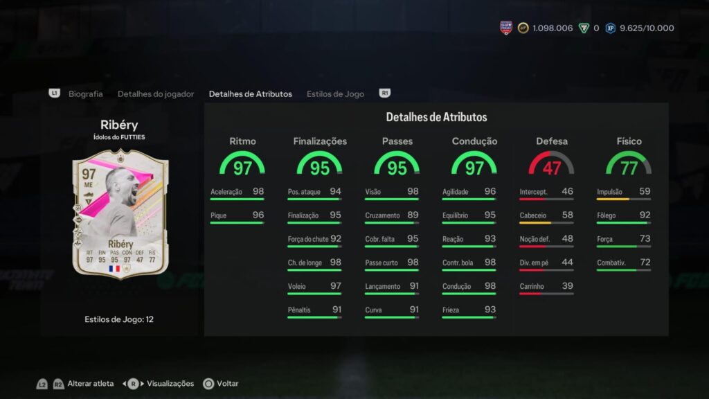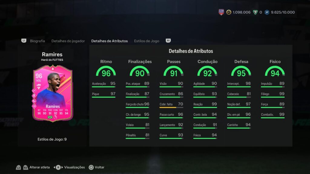 Na questão de atributos, vale o destaque para seu Ritmo, Finalização, Passe e Condução, todos eles acima de 95.