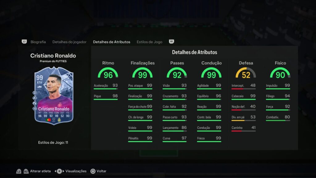 Além disso, a versão FUTTIES de Cristiano Ronaldo conta com 4 playstyles+: Chute colocado, Pombo sem asas, Testada firme e Veloz.