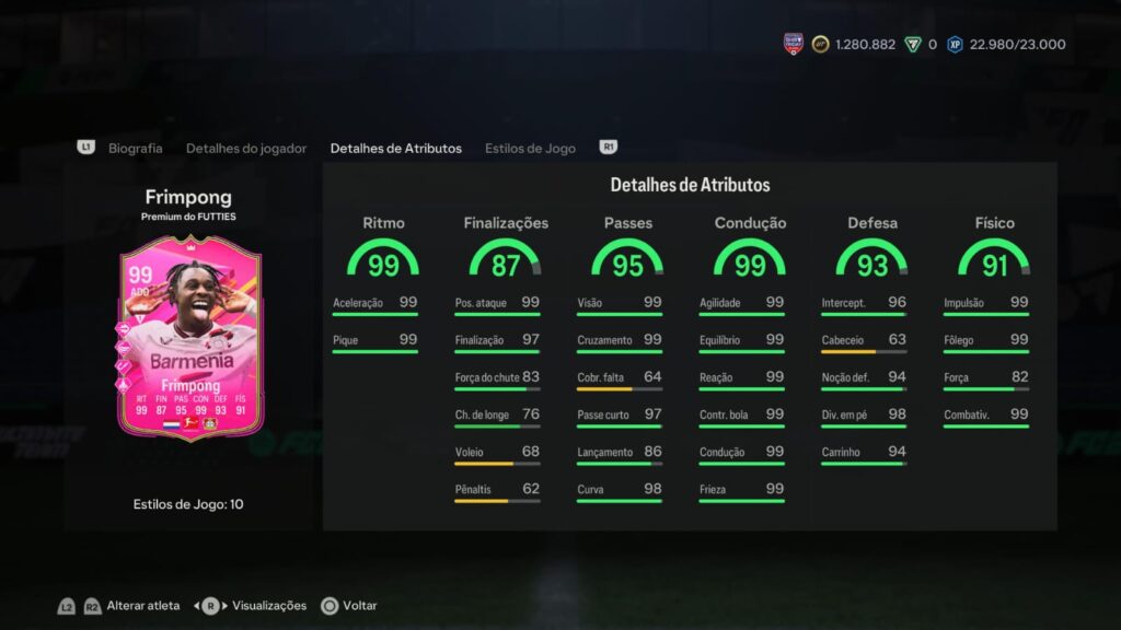 Além de ser uma carta 5/5, isto é, ter 5 estrelas de Fintas e 5 de Perna Ruim, Frimpong possui também dedicação Alta para ataque e Alta para defesa.