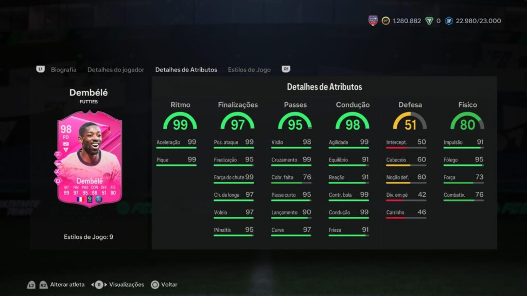 Essa versão de Ousmane Dembélé possui 5 estrelas de Fintas e 5 de Perna Ruim.