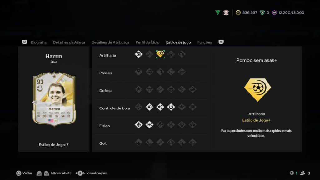 Por fim, vale o destaque para sua playstyle+ Pombo sem asas, onde faz superchutes com mais rapidez.
