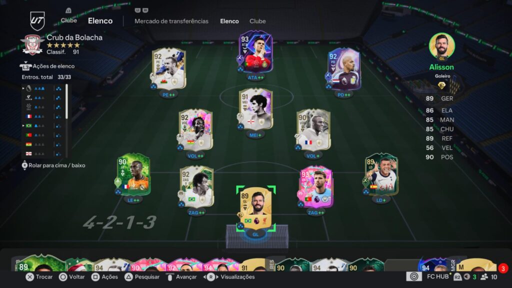 - Estilo ofensivo: “Equilibrado” ou “Posse de bola” funcionam bem com formações compactas como a 4-3-2-1. Já o estilo “Corridas equilibradas” nos atacantes ajuda a manter variações no ataque, evitando a previsibilidade.