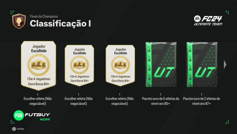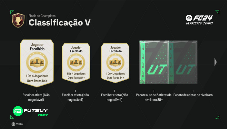 Classificação 5: 3x 1 de 4 84+ Rare Gold Player Pick, x1 85+ x2 Rare Gold Player Pack, x1 Rare Players Pack, x1 Ultimate Pack, 1.250 pontos de qualificação de campeões, 30.000 moedas, 1.350 XP