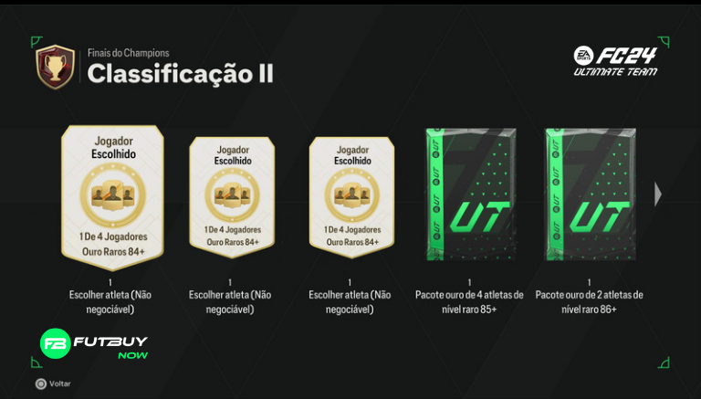 Classificação 2: 3x 1 de 4 84+ Rare Gold Player Pick, x1 85+ x4 Rare Gold Player Pack, x1 86+ x2 Rare Gold Players Pack, x2 Ultimate Pack, 1.250 pontos de qualificação de campeões, 100.000 moedas, 1.500 XP