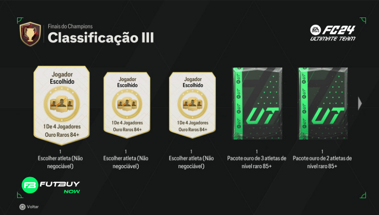 Classificação 3: 3x 1 de 4 84+ Rare Gold Player Pick, x1 85+ x3 Rare Gold Player Pack, x1 85+ x2 Rare Gold Players Pack, x1 Jumbo Rare Players Pack, x1 Ultimate Pack, 1.250 pontos de qualificação de campeões, 85.000 moedas, 1.500 XP
