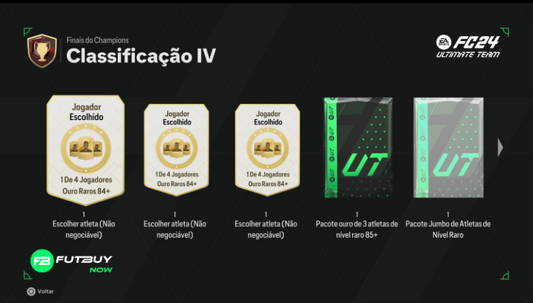 Classificação 4: 3x 1 de 4 84+ Rare Gold Player Pick, x1 85+ x3 Rare Gold Player Pack, x1 Jumbo Rare Players Pack, x1 Ultimate Pack, 1.250 pontos de qualificação de campeões, 50.000 moedas, 1.500 XP