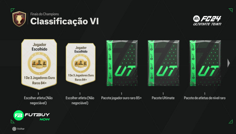 Classificação 6: 2x 1 de 3 84+ Rare Gold Player Pick, x1 85+ Rare Gold Player Pack, x1 Ultimate Pack, x1 Rare Players Pack, 1.250 pontos de qualificação FUT Champions, 25.000 moedas, 1.150 XP