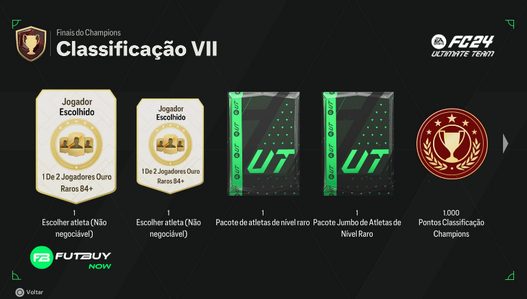 Classificação 7: x2 1 de 2 84+ Rare Gold Player Pick (não negociável), x1 Rare Players Pack, x1, Jumbo Rare Players Pack, 1.000 pontos de qualificação de campeões, 15.000 moedas, 1.000 XP