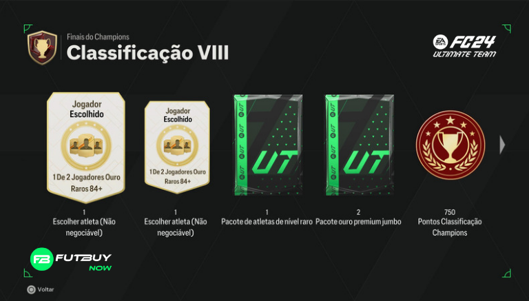 Classificação 8: x2 1 de 2 84+ Rare Gold Player Pick (não negociável), x1 Rare Players Pack, x2 Jumbo Premium Gold Pack, 750 pontos de qualificação de campeões, 10.000 moedas, 750 XP