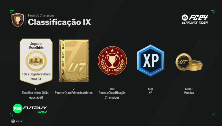 Rank 9: 1 de 2 84+ Rare Gold Player Pick (não negociável), x2 Prime Gold Players Pack, 500 pontos de qualificação de campeões, 5.000 moedas, 500 XP.