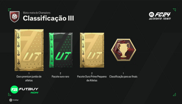 Rank 3: x1 Pacote de Jogadores Jumbo Premium Gold, x2 Pacotes de Ouro Raro, x2 Pacotes de Jogadores Pequenos Prime Gold e Qualificação Final